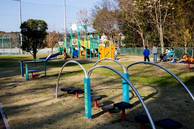 | 遊具の広場は、南側の入り口近くにあります。手前は主に年配者向けの健康遊具。 |