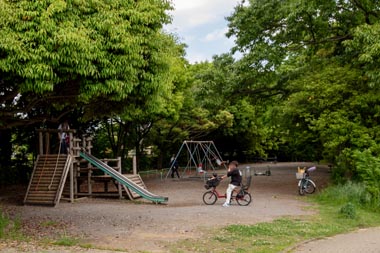 駐車場の右手に進むと四阿があって、その先のちょっと高くなったエリアが遊具が並んだ児童広場です。