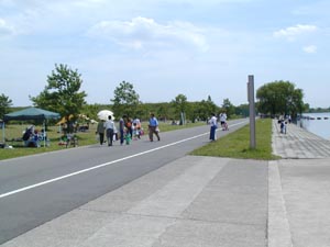 | サイクリングロードから公園の堤防を見ています。 左に広がる水辺は当然彩湖です。 |