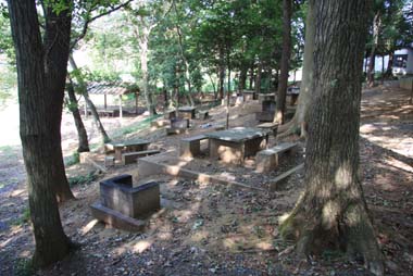 かまどが全部で10基。それぞれにコンクリート製のテーブルと椅子が付設されています。「憩いの森」は全体が斜面になっていて、かまどもテーブルセットも斜面に張り付くように建てられていました。洗い場完備。屋根があり、水道は8栓ありました。