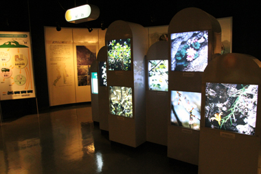 武甲山資料館の展示室は、ほぼ正方形の部屋が一室あるのみです。入口から入るとまず案内VTRがあり、左手から「秩父産地のおいたち」「石灰岩の利用と分布」「武甲山の植物」「武甲山周辺に生息する動物」とブースが時計回りに並んで、中央に「武甲山の地形と地質」が展示されています。