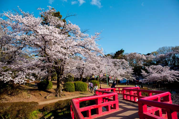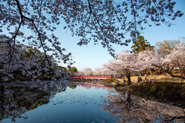 一番の有名な桜観賞スポットは、菖蒲池とそこの架けられた赤い橋(八ツ橋)と桜の織りなす絶景でしょうか。