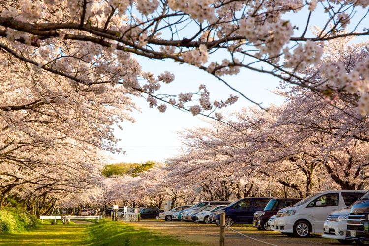 普段はこのあたりは駐車場として解放していません。本来の駐車場は下の写真の右手にある道路の更に右側にあります。ご覧いただくとおり、このあたりが桜の密度が最も濃いのです。