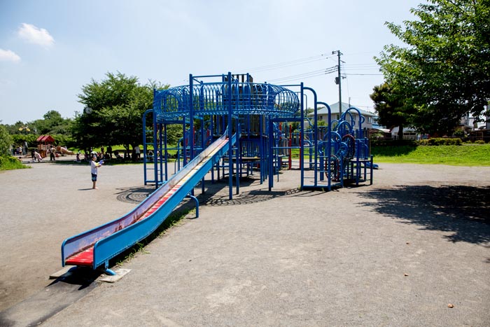 長いローラー滑り台を中心に、短い滑り台、うんてい、木の吊り橋風、金属のバネを半円形に曲げたようなトンネルなど多彩な遊具が組み合わされています。