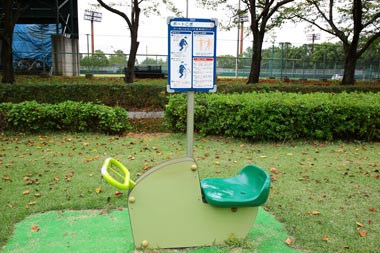 | 健康遊具は、野球場と調整池の間の芝生広場にあります。 |