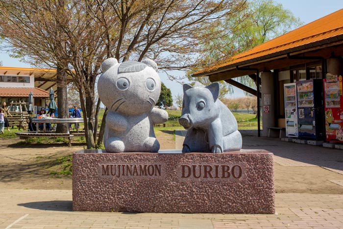 キヤッセ羽生の「ムジナモ市場」と「むじな庵」の間を抜けた遊具広場の前に、羽生市のマスコット(ゆるキャラ)「ムジナもん」と「DURIBO」の石像が建っています。