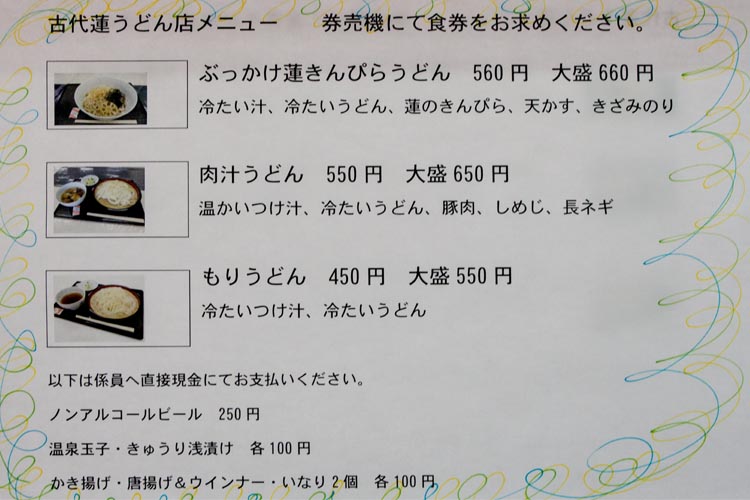 うどんのメニューは2017年7月現在、「ぶっかけ蓮きんぴらうどん 560円」「肉汁うどん 550円」「もりうどん 450円」のみ。潔く3種類しかありません。大盛はそれぞれ100円増しです。