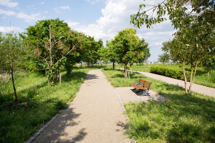 | 中央の白い道が中小の池の間に通る園路です。 右が小さい池で左が中くらいの池です。 看板を見ると右の小さい方をトンボ池と呼ぶみたいです。 |