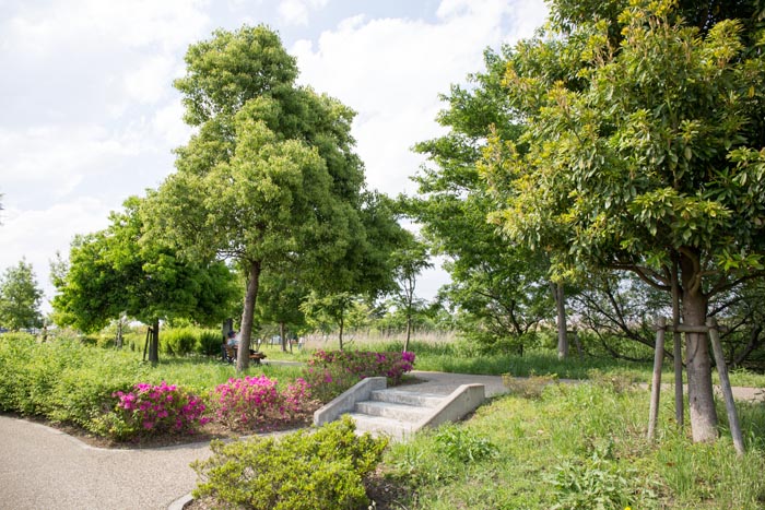 | ヘアピンを戻らず、直角に曲がる園路もあります。 この写真は直角にカーブする園路です。 |