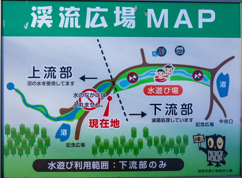 下に掲載した案内看板にも表示はありますが、2020年はコロナ禍のため水路は閉鎖され水遊び不可でした。