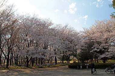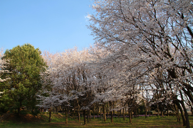 内牧公園の桜は、貨車の管理事務所がある広場、サイクリングロード沿いに桜並木、ログハウスの管理事務所近くのお花見広場と大きく分けて三ヶ所に分布しています。